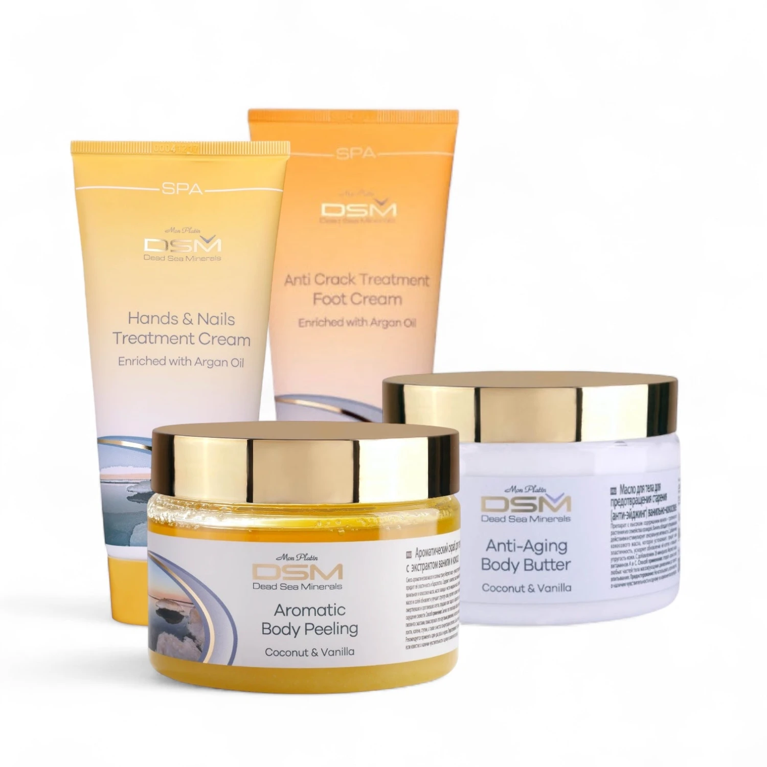Indulge your senses and elevate your self-care routine with the DSM Total Body Care Bundle, infused with the delightful scent of coconut and vanilla. This luxurious set includes four essential products designed to nourish, rejuvenate, and pamper your skin from head to toe.
