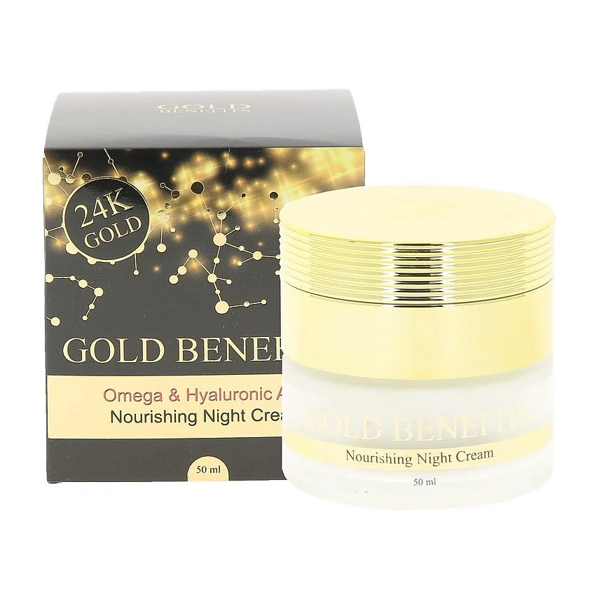 Experience the ultimate nighttime skincare ritual with Gold Benefits Nourishing Night Cream, specially crafted to rejuvenate and revitalise mature skin. Enriched with a powerful blend of plant-based omega fatty acids, hyaluronic acid, and 24-karat gold, this velvety soft cream offers a multitude of benefits tailored to address the unique needs of aging skin.