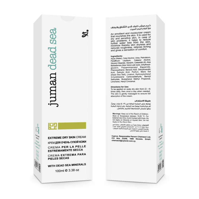 Juman Extreme Dry Skin Cream with Dead Sea Minerals is formulated with emollients and moisturising agents that nourish the skin. It is specifically designed for individuals with dry and sensitive skin. The cream provides essential hydration and alleviates irritated skin by minimising water loss, thus reducing dryness and roughness. As a result, it offers relief from itching and ensures the skin feels comfortable and rejuvenated.