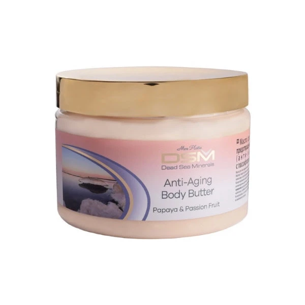 Anti Aging Body Butter Passion Fruit & Papaya is an exclusive product containing a complex of olive and coconut oils, enriched with shea butter, vitamins and Dead Sea minerals. The body butter is highly concentrated, naturally rich and contains anti-oxidants. Its invigorating scent is believed to arouse desire and passion.